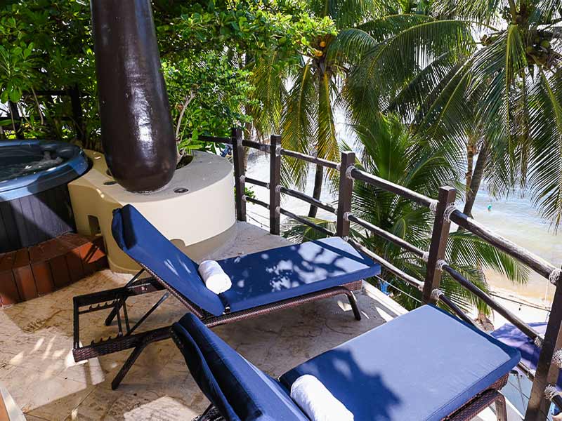 This unit has a wrap around private terraces including a private Jacuzzi with access from the living room and master bedroom. The living room has curved windows facing the beach plus two large sliding glass doors leading out to the private terrace. The terrace also has lounge chairs and offers a dining table for romantic sea side dinning Turquoise colors used in the décor match the color of the Caribbean Sea, seen from each window. Soak in your own Jacuzzi, while gazing at the bright tropical stars while enjoying the mist and sound or the ocean waves.