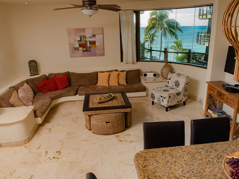 It features its own private wrap around terrace with outdoor Jacuzzi and a separate sun parlor with an outdoor wet bar and refrigerator. Each bedroom also has its own terrace with views of the ocean. Enjoy dining or lounging on your private terrace with spectacular ocean views. Enjoy modern appliances of the gourmet kitchen, sink into the comfortable couches of your large living room, and admire its elegant, earth-toned décor. The living room has curved windows facing the beach plus two large sliding glass doors leading out to the private terrace. Take advantage of your terrace and soak in your own Jacuzzi, while watching the bright tropical stars and views of Cozumel on the horizon of the sea.